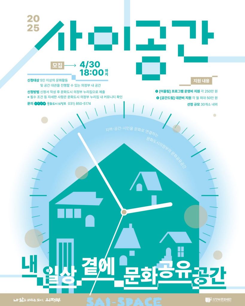 (재)의정부문화재단(이사장 김동근, 이하 재단)은 문화도시조성사업의 주요 과제인 '15분 문화생활권' 조성을 위해 2025 문화 공유공간 지원사업 '사이공간' 참여 공간을 오는 30일까지 모집한다고 22일 밝혔다.
