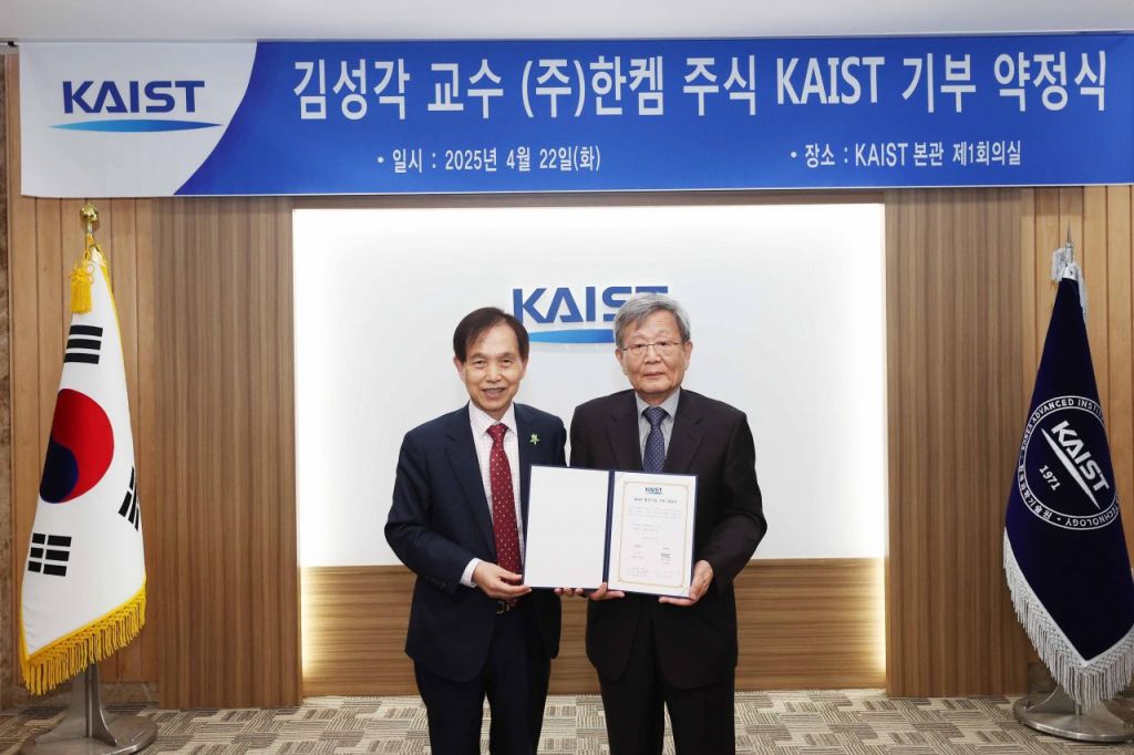 KAIST는 22일 김성각 화학과 명예교수가 12억원 상당의 ㈜한켐 주식12만주를 기부했다고 밝혔다.