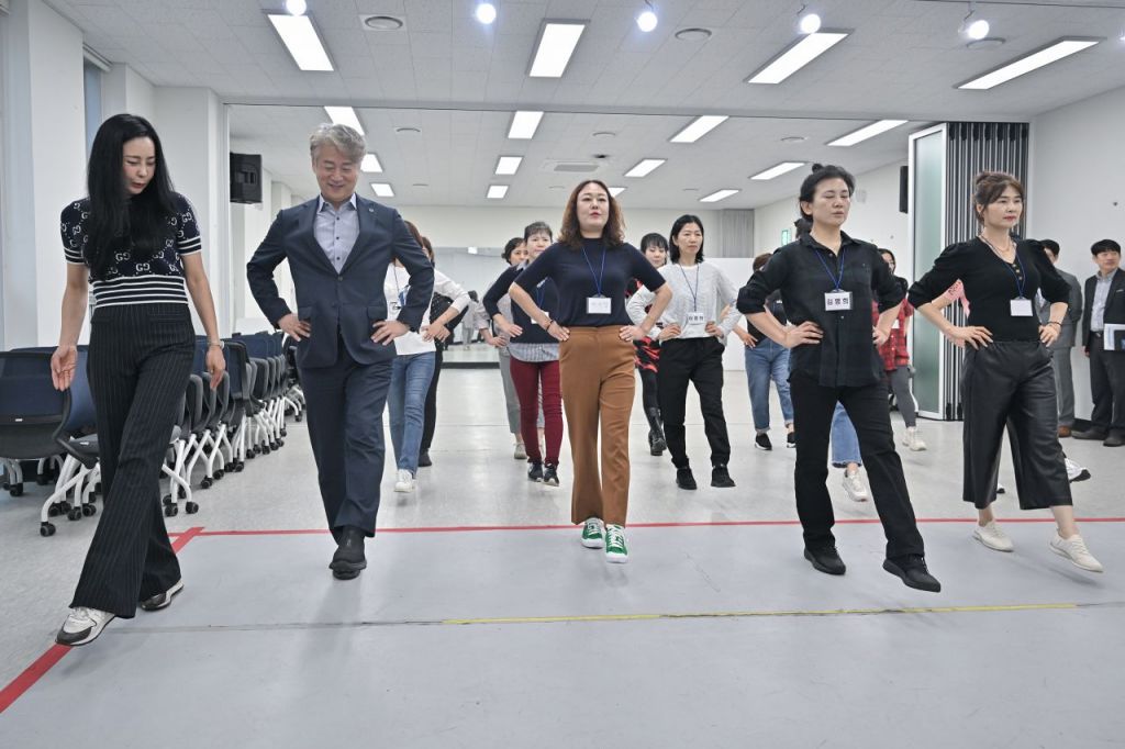 김이강 광주 서구청장이 22일 서구 청소년꿈누리센터에서 '세큰대(세상에서 가장 큰 대학, 서구)'의 정규강좌인 바른자세모델워킹 수강생들과 함께 모델 워킹을 배우고 있다. 광주 서구 제공