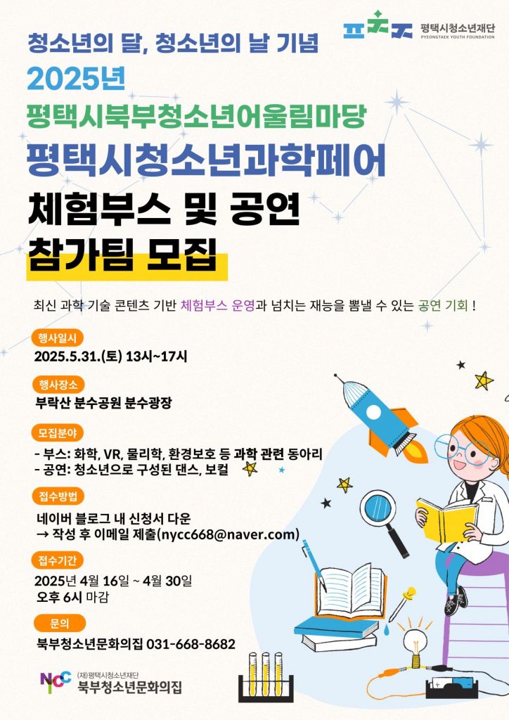 평택시 청소년과학페어는 청소년의 달인 5월과 청소년의 날인 마지막 주 토요일을 기념해 다음 달 31일 열리는 최신 과학기술 콘텐츠 기반의 과학 축제다. 행사는 부락산 분수공원 광장에서 개최된다.