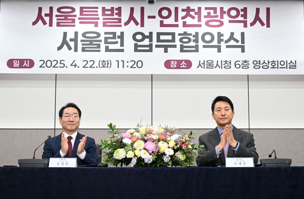 오 시장은 22일 오전 서울시청 영상회의실에서 유정복 인천시장과 함께 '서울시-인천시 교육격차 해소를 위한 업무협약'을 체결했다.