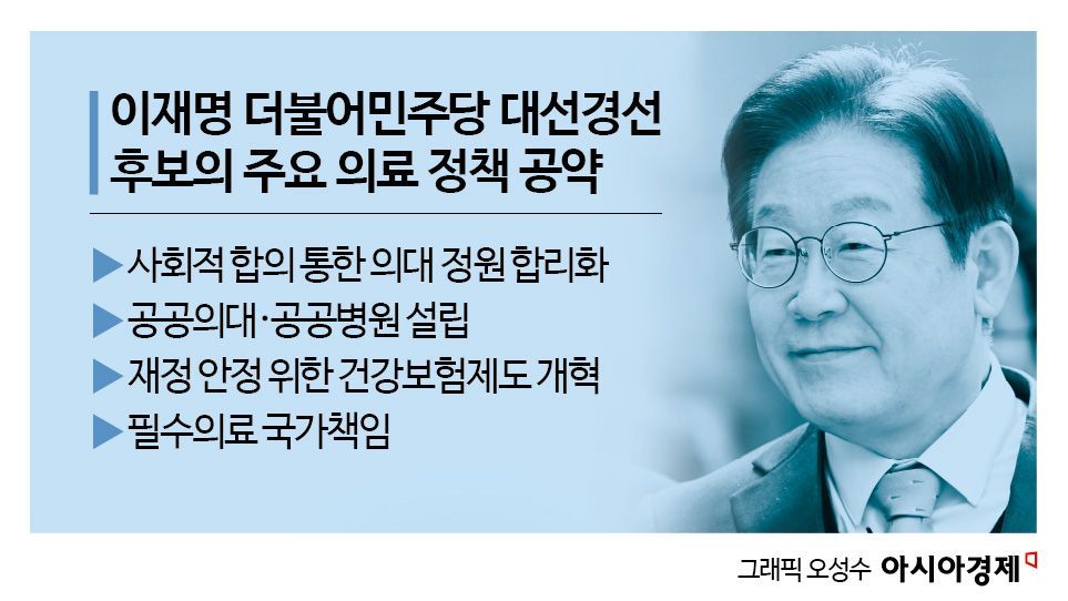 이재명 더불어민주당 대선 경선 후보가 사회적 합의를 통한 의대 증원 규모 결정, 공공의대 설립 등을 포함하는 의료 정책 공약을 내놓으면서 의료계가 바짝 긴장하고 있다. 오는 6월 조기 대선에서 민주당이 정권 교체에 성공할 경우, 앞서 윤석열 정부의 의대 증원으로 촉발돼 15개월 가까이 계속돼 온 의정 갈등이 이번엔 공공의대 설립 찬반 논란으로 옮겨붙을 수 있다는 우려가 나온다.