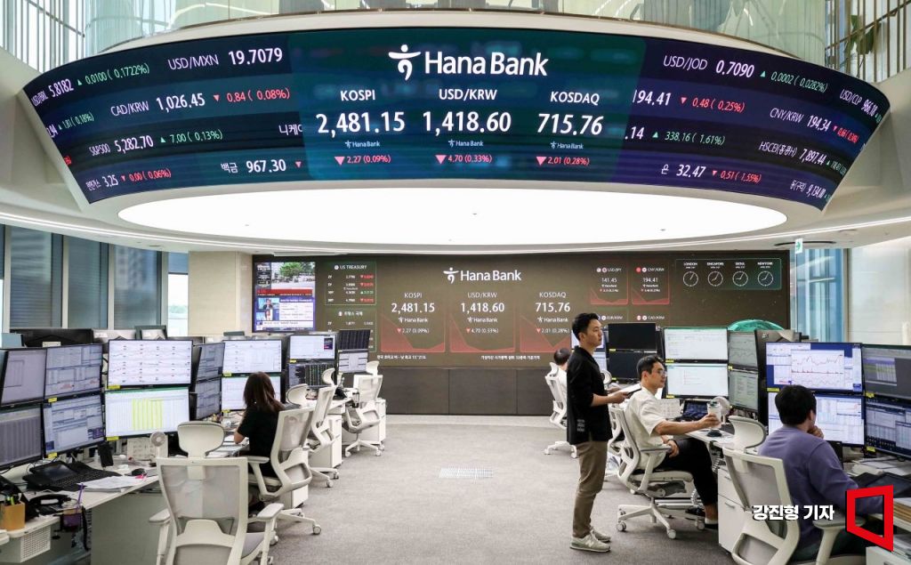 코스피 지수가 한미 정부의 관세 관련 협상과 본격적인 실적 시즌을 앞두고 보합권에 장을 시작한 21일 서울 중구 하나은행 본점 딜링룸에서 딜러들이 업무를 보고 있다. 이날 원달러 환율은 전 거래일 대비 3.3원 내린 1420원에 거래를 시작했다. 2025.4.21. 강진형 기자