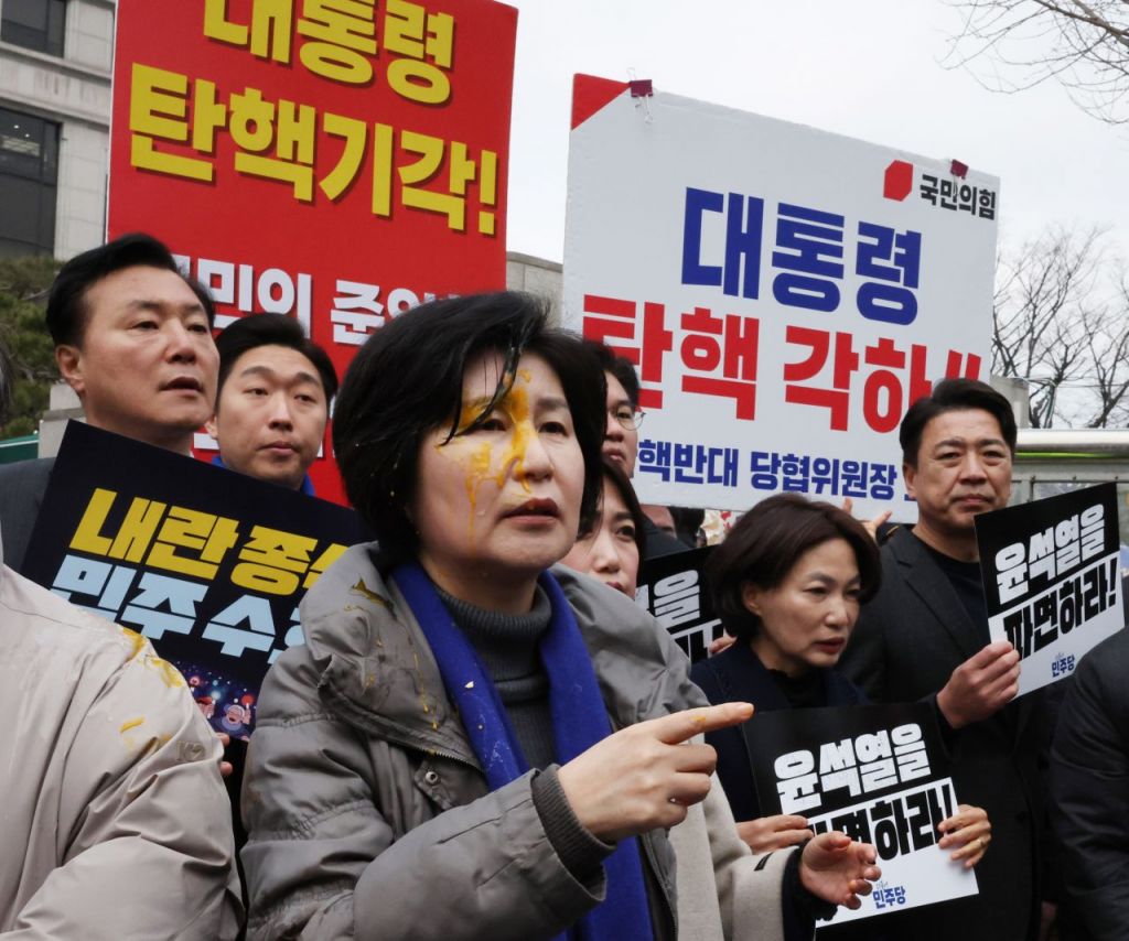 지난달 20일 서울 종로구 헌법재판소 앞에서 기자회견에 참여 중이던 더불어민주당 백혜련 의원이 계란을 맞은 채 발언하고 있다. 연합뉴스