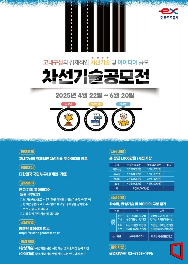 도로공사 관계자는 "이번 공모전을 통해 수요자 중심의 실용적인 차선 기술이 발굴되기를 기대한다"며 "국민 여러분의 많은 관심과 참여를 바란다"고 말했다.