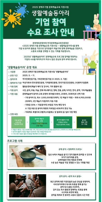 문체부 정책 담당자는 "생활예술동아리 시범사업은 일상에서 시간이나 비용의 제약으로 참여가 어려웠던 국민이 문화예술교육을 향유하는 데 앞장서는 정책이 될 것"이라며 "시범사업의 성과를 고려해 수혜기업 규모를 확대하고 지자체와 연계한 지역 예술동아리로 지원 범위를 확장할 계획"이라고 밝혔다.