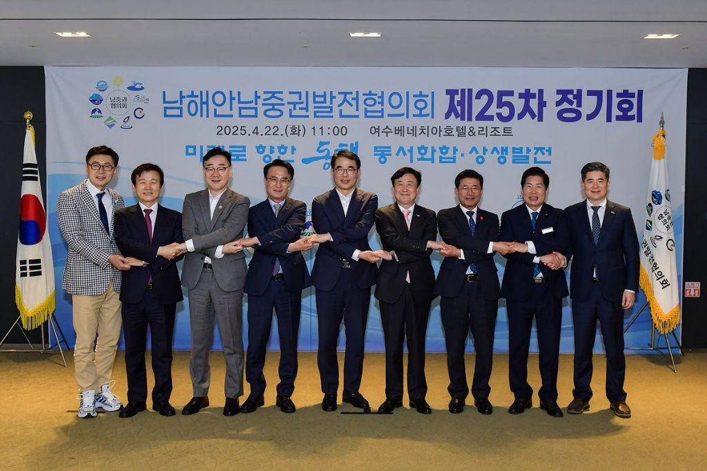 남해안남중권발전협의회가 지난 22일 9개 회원 시군 단체장과 80여 명의 실무진이 참석한 가운데 제25차 정기회를 여수에서 열고 2026여수세계섬박람회 성공개최 업무협약을 체결, 제33차 유엔기후변화협약 당사국 총회의 대한민국 유치 확정과 남해안 남중권을 개최 장소로 지정해줄 것을 건의하는 공동건의문을 채택하는 등 7건의 안건을 의결했다. 여수시 제공