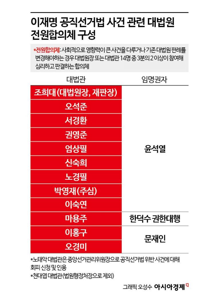당초 이 사건은 오경미·권영준·엄상필·박영재 대법관으로 구성된 대법원 2부에 배당됐다. 소부는 통상적인 사건을 처리하는데 조 대법원장과 천대엽 법원행정처장(대법관)을 뺀 대법관 12명이 각각 4명씩 3개 소부를 구성한다. 전원합의체는 재판업무를 담당하지 않는 법원행정처장을 뺀 대법관 12명과 대법원장(재판장)으로 구성되는데 이번 사건에서는 중앙선거관리위원장을 겸직하고 있는 노태악 대법관이 선거관리에 따른 중립성 시비를 차단하기 위해 스스로 사건에서 회피해 대법원장 포함 12명으로 구성됐다.