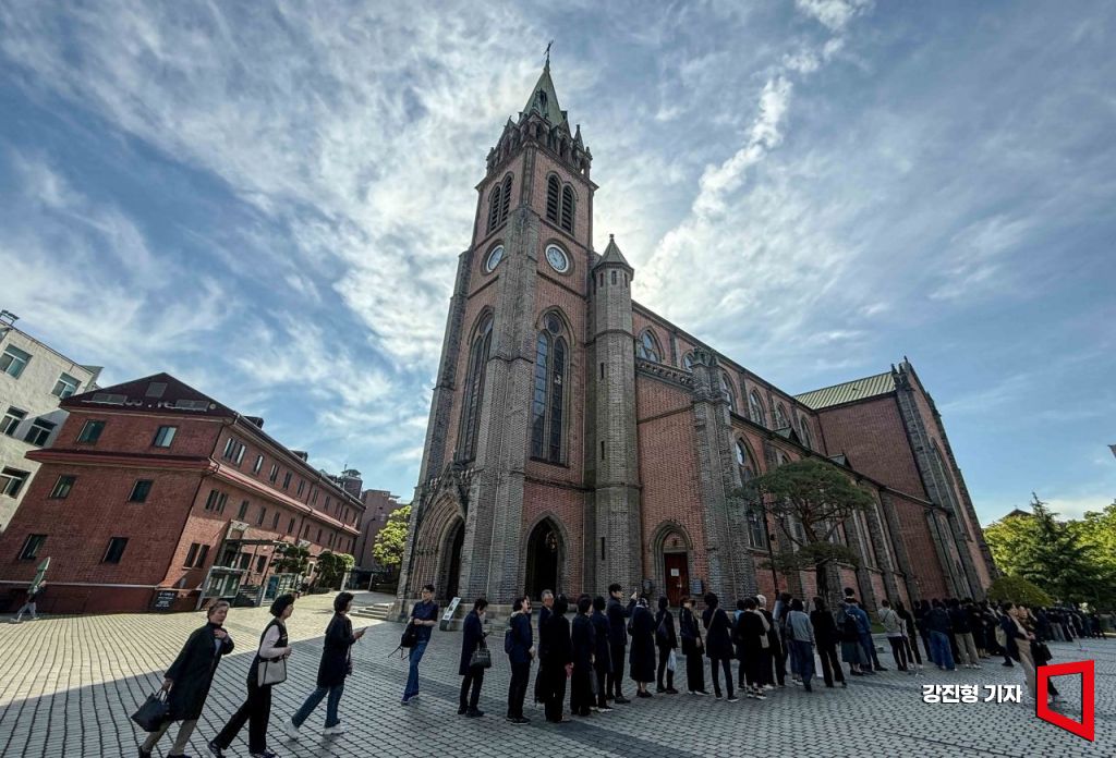 프란치스코 교황이 선종한 가운데 23일 추모 빈소가 마련된 서울 중구 명동성당을 찾은 카톨릭 신자들이 조문 하기 위해 줄을 서고 있다.