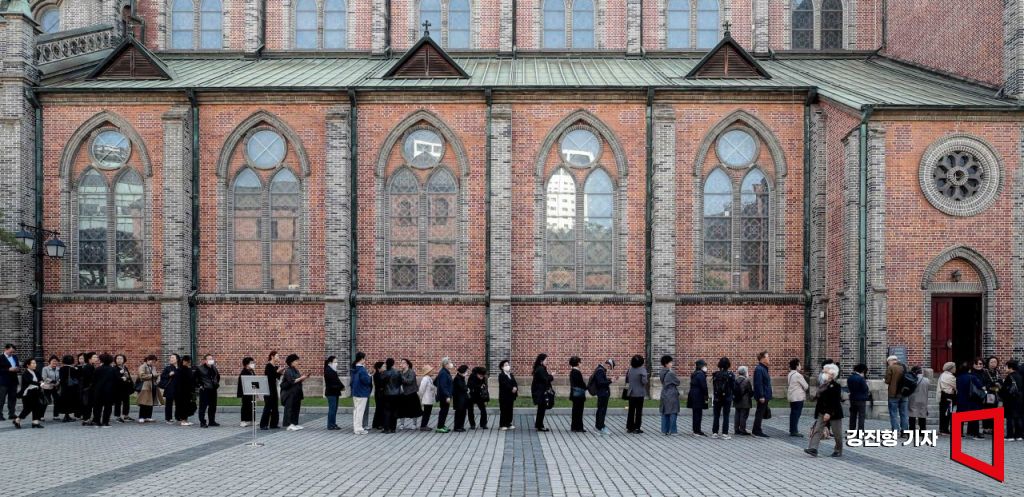 프란치스코 교황이 선종한 가운데 23일 추모 빈소가 마련된 서울 중구 명동성당을 찾은 카톨릭 신자들이 조문 하기 위해 줄을 서고 있다.
