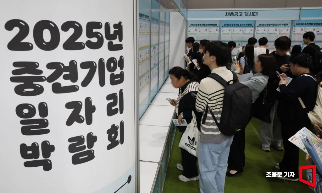 23일 서울 강남구 코엑스에서 열린 2025년 중견기업 일자리 박람회를 찾은 구직자들이 채용공고 게시판을 살펴보고 있다.