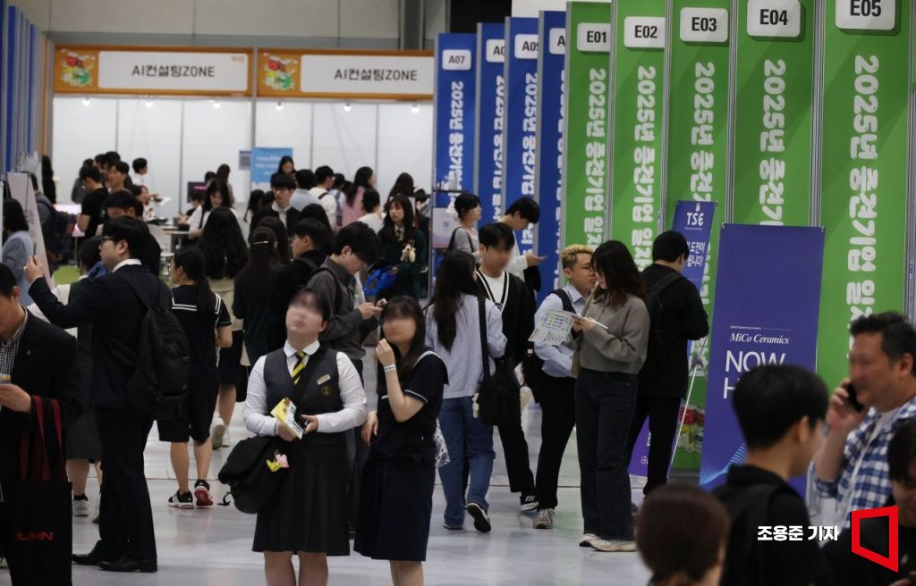 23일 서울 강남구 코엑스에서 열린 2025년 중견기업 일자리 박람회를 찾은 많은 구직자들이 채용공고 게시판을 살펴보고 있다.