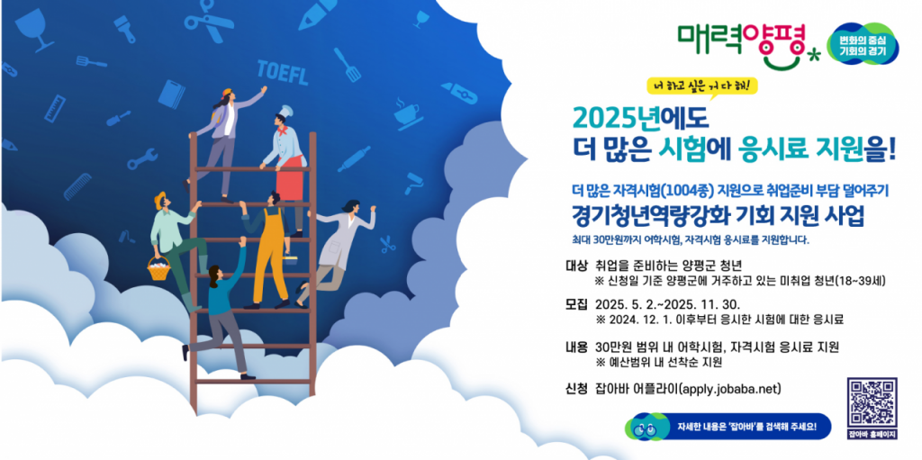 경기 양평군(군수 전진선)은 관내 거주 미취업 청년을 대상으로 취업에 필요한 어학 및 자격시험 응시료를 지원하는 '2025년 경기청년 역량 강화 기회 지원 사업'을 추진한다고 23일 밝혔다. 이번 사업은 고물가 시대 청년들의 취업 준비 비용 부담을 완화하고, 고른 취업 기회를 제공하기 위해 마련됐다.