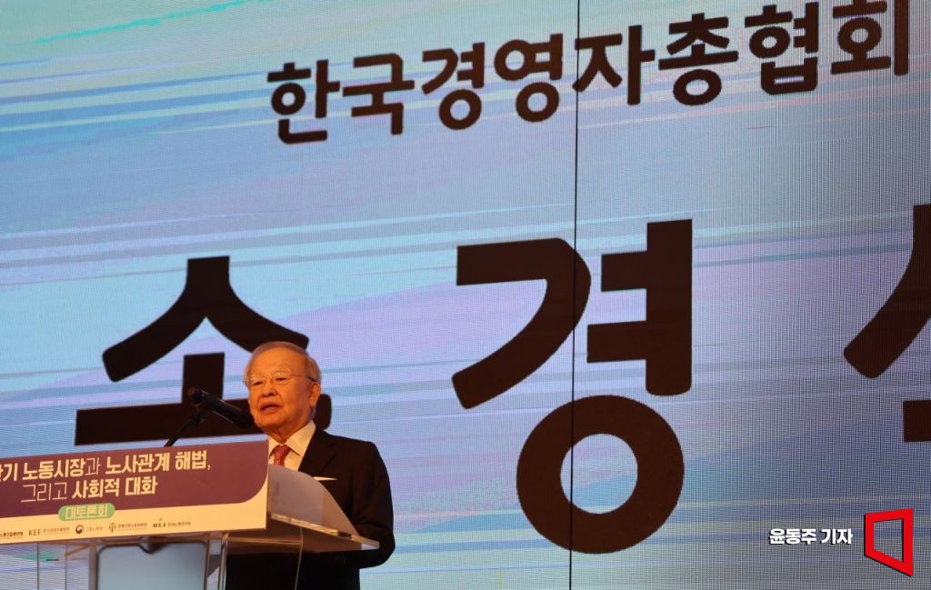 26일 서울 여의도 중소기업중앙회에서 노사정 대표자들이 '전환기 노동시장과 노사관계 해법, 그리고 사회적 대화 대토론회'를 개최했다. 행사에 참석한 손경식 한국경영자총협회 회장이 개회사를 하고 있다. 2025.03.26 윤동주 기자