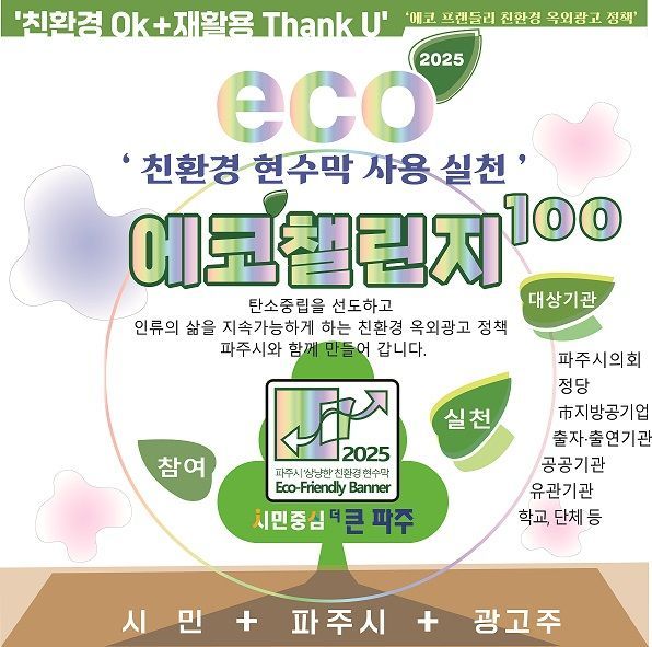 '에코챌린지 100'은 파주시가 기관, 학교, 단체들을 설득하고 동의를 얻어 탄소중립과 환경보전을 위한 친환경 현수막 사용 실천과 환경문제에 적극 참여하겠다는 의지를 담은 '참여 의향서'에 서명 후 시민들에게 공개하는 방식으로 진행될 예정이다.