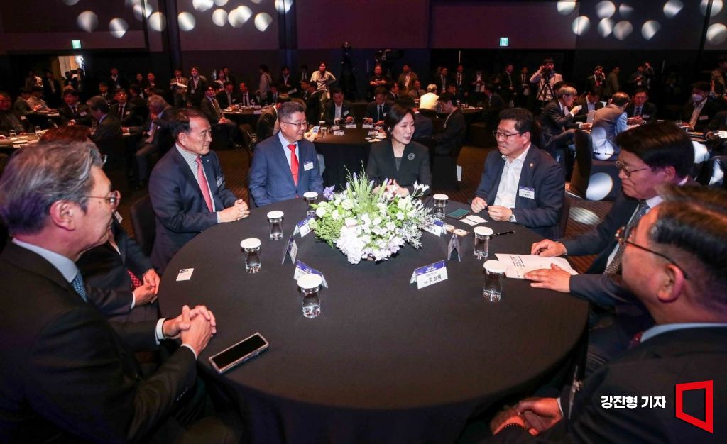 오영주 중소벤처기업부 장관을 비롯한 점프업 프로그램 참여 기업 대표들이 23일 서울 중구 신라호텔에서 열린 '점프업 프로그램 출정식'에서 의견을 나누고 있다.