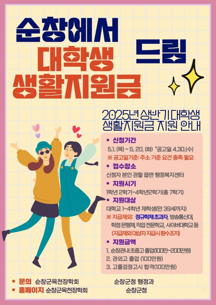 지원 대상은 관내 초·중·고등학교를 졸업한 대학생 중에서, 2025년 상반기 공고일(4월 30일) 기준 본인과 부 또는 모 중 한 명이 1년 이상 순창군에 주민등록이 되어 있을 경우 최대 200만 원이 지급된다.