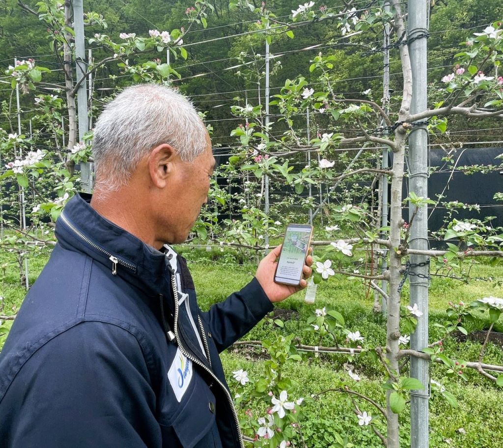장성군 농가에서 스마트폰 앱을 활용해 과수 화상병 예찰 작업을 진행하고 있다. 장성군 제공