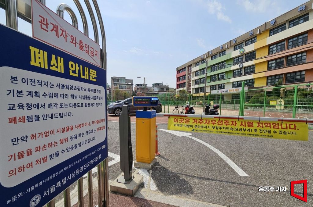 전국 초·중·고등학교 새 학기가 시작된지 얼마 지나지 않았던 지난 4월1일. 서울 광진구 화양동에 위치한 5층 높이의 초등학교를 찾았다. 오전 8시50분, 학교 앞은 한산했다. 등교하는 학생이나 학부모는 길거리에서 전혀 찾아볼 수 없었다. 가끔 담배를 태우러 나오는 노인만 학교 건물을 기웃거리는 정도였다. 그러고 보니 학교 건물에 달린 시계도 3시50분에 멈춰 있었다. 2023년 폐교된 화양초등학교와 인근의 풍경이다.