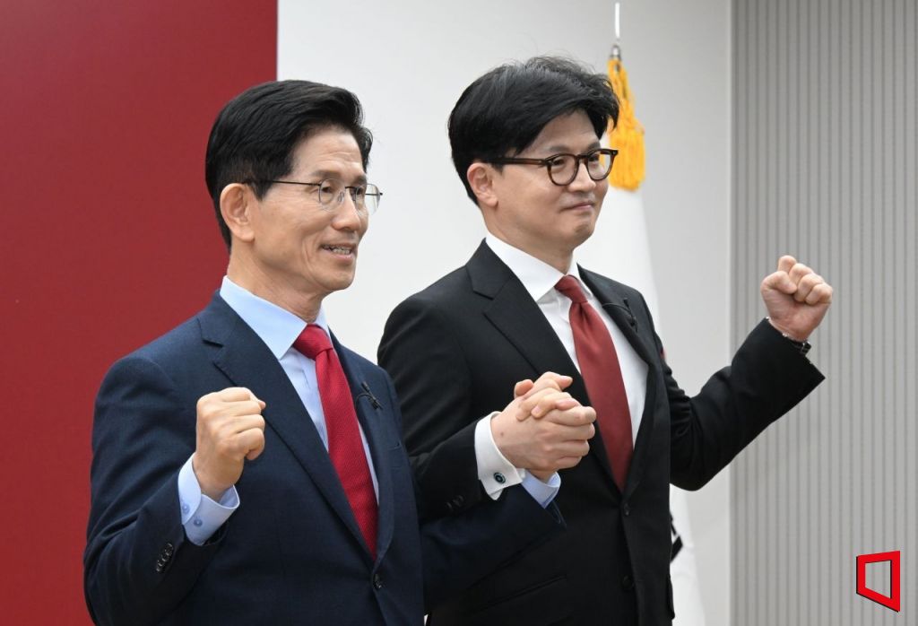 23일 서울 여의도 국민의힘 중앙당사에서 열린 2차 경선 토론회 미디어데이에서 국민의힘 김문수, 한동훈, 대선 경선 후보가 맞수 토론 대상으로 지명을 한후 기념촬영을 하고 있다. 2025.4.23 국회사진기자단
