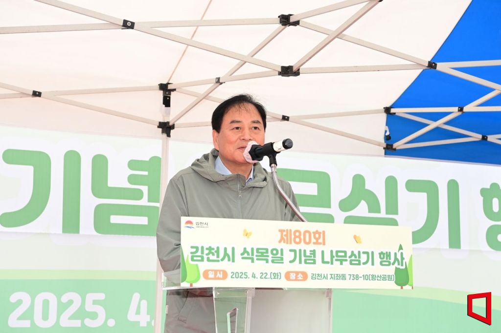 배낙호 김천시장이식목일 기념 나무심기 행사에서 기념사를 하고 있다.