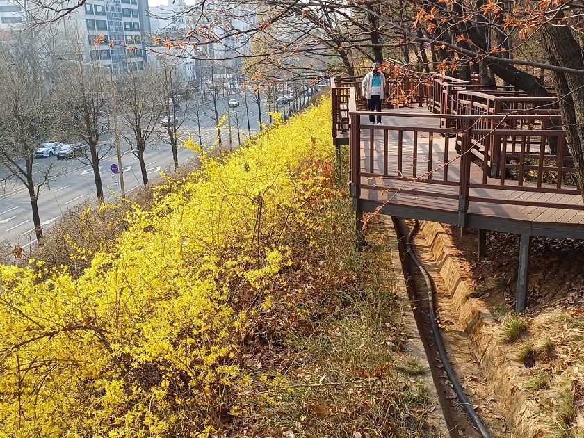 먼저, 시각과 촉각을 만족시키는 봄 꽃길을 소개한다. 지금 '오금공원'은 노란 개나리와 연분홍 철쭉에 둘러싸여 장관을 이룬다. 4월 중순이 지나면서 오금역부터 개롱역까지 2km 구간에 활짝 핀 노란 개나리 길이 아름다운 절경을 연출한다.