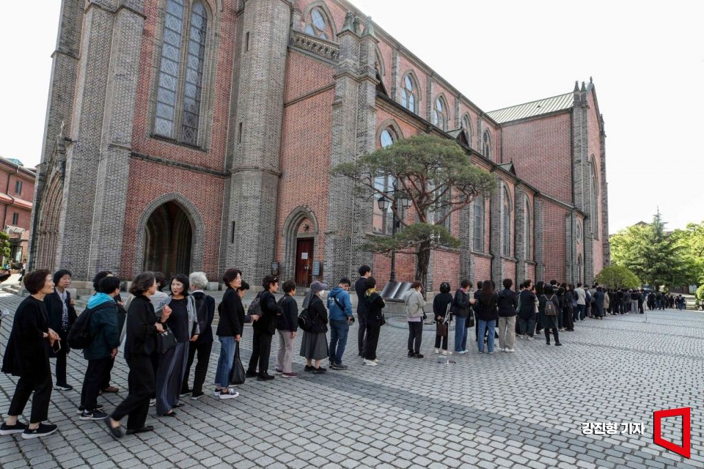 프란치스코 교황이 선종한 가운데 23일 추모 빈소가 마련된 서울 중구 명동성당을 찾은 카톨릭 신자들이 조문 하기 위해 줄을 서고 있다. 2025.4.22. 강진형 기자