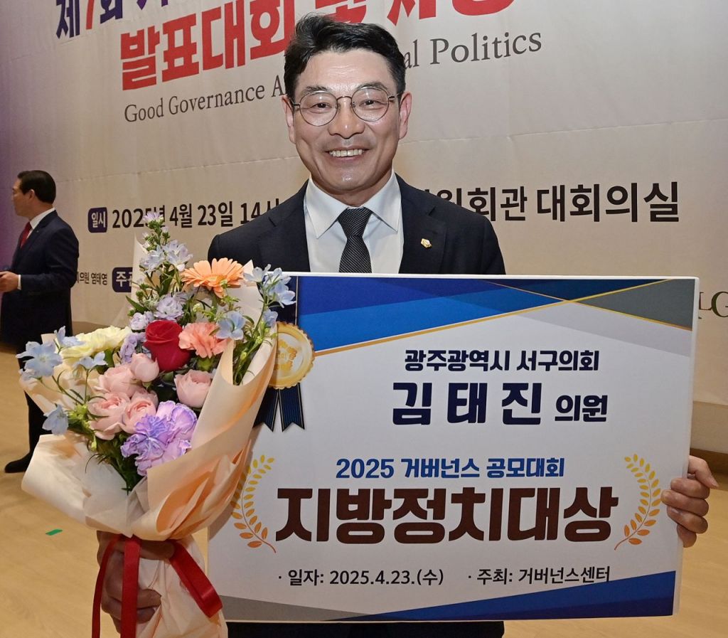 광주 서구의회 김태진 의원이 지난 23일 국회의원회관 대회의실에서 열린 거버넌스 지방정치대상 시상식에서 갈등 해소·사회통합 분야 '최우수상'을 받았다.