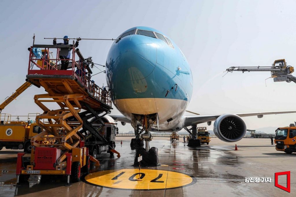 24일 인천 중구 대한항공 항공기 정비고에서 대한항공 관계자들이 새로운 CI가 적용된 항공기 동체를 세척하고 있다.