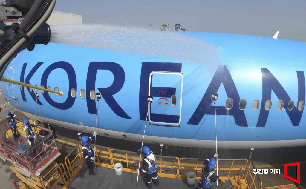 24일 인천 중구 대한항공 항공기 정비고에서 대한항공 관계자들이 새로운 CI가 적용된 항공기 동체를 세척하고 있다.