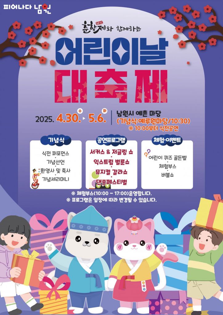 행사는 남원예촌 마당에서 열리며 ▲서커스&저글링 공연 ▲어린이집 재능공연 ▲청소년 어울림 마당 ▲익스트림 벌룬쇼 ▲어린이 뮤지컬 갈라쇼 등의 다양한 공연 콘텐츠가 마련돼 어린이들에게 즐거움을 선사할 예정이다. 이와 함께 가족 단위 관람객이 참여할 수 있는 놀이체험 부스를 운영하여 축제의 풍성함을 더할 것으로 보인다.