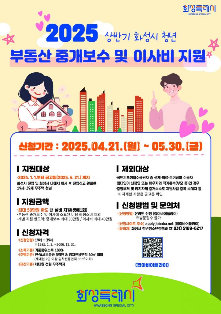 경기도 화성시는 청년들의 주거비 부담을 완화하고 안정적인 지역 정착을 돕기 위해 '화성시 청년 부동산 중개보수 및 이사비 지원사업'을 신규 시행한다고 24일 밝혔다.