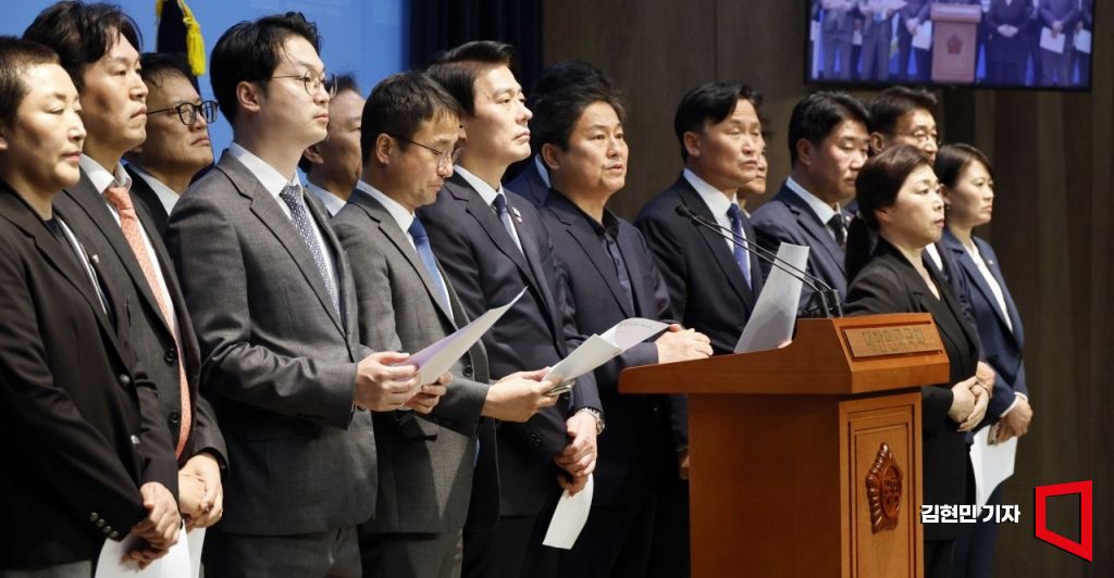 더불어민주당 전정권정치탄압대책위원회 위원들이 24일 국회 소통관에서 문재인 전 대통령 기소 관련 긴급 기자회견을 하고 있다.