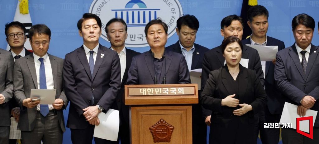 더불어민주당 전정권정치탄압대책위원회 위원들이 24일 국회 소통관에서 문재인 전 대통령 기소 관련 긴급 기자회견을 하고 있다.