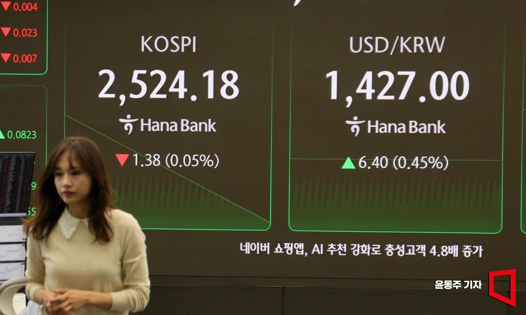 24일 한국경제가 3분기만에 마이너스 성장을 기록한 보도가 나오자 코스피 지수가 마이너스로 전환되고 있다. 서울 중구 하나은행 딜링룸 지수 현황판에 코스피 지수가 표시되고 있다. 2025.04.24 윤동주 기자