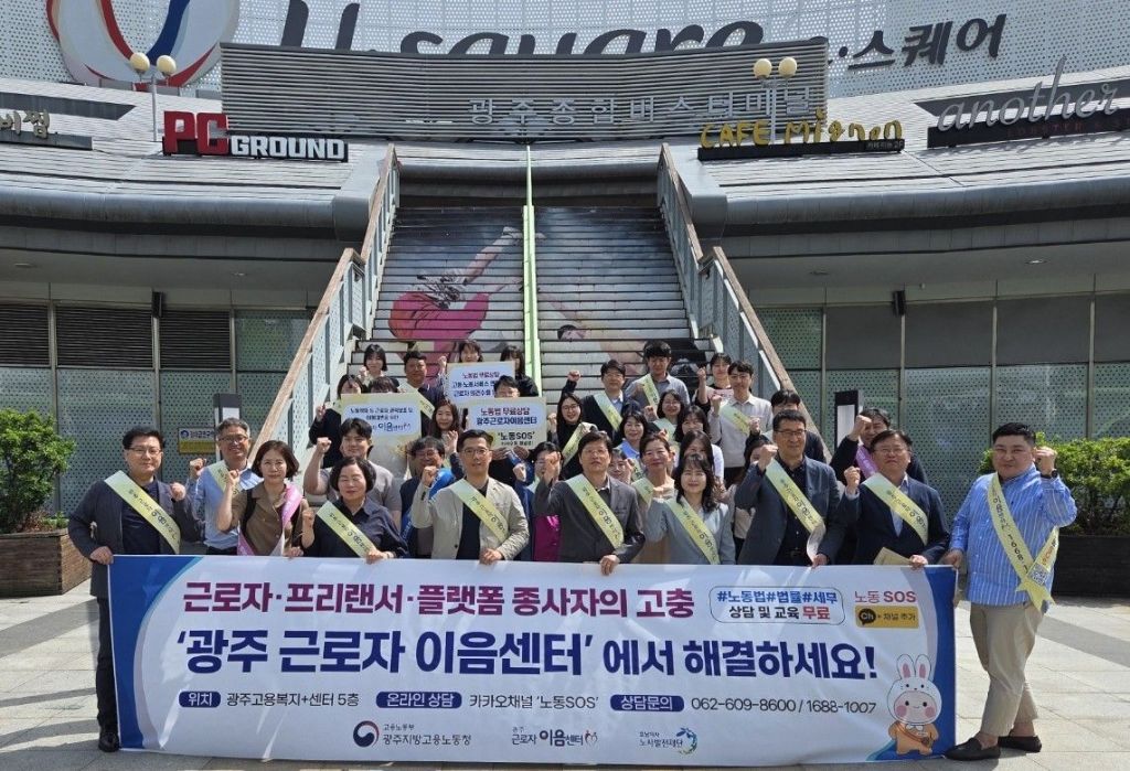 노사발전재단 호남지사(지사장 강수영)는 24일 오후 광주종합버스터미널 유스퀘어 일대에서 광주지방고용노동청(청장 이도영)과 함께 미조직 근로자의 권익 보호를 위한 '근로자 이음센터' 홍보캠페인을 펼쳤다.
