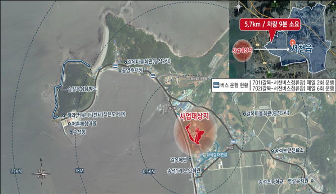 주택단지는 서천읍에서 6km 떨어진 지역으로 기존 마을 및 초등학교 등 공공시설 접근성이 뛰어나 자녀가 있는 청년 어업인이 거주하기에 적합하다.