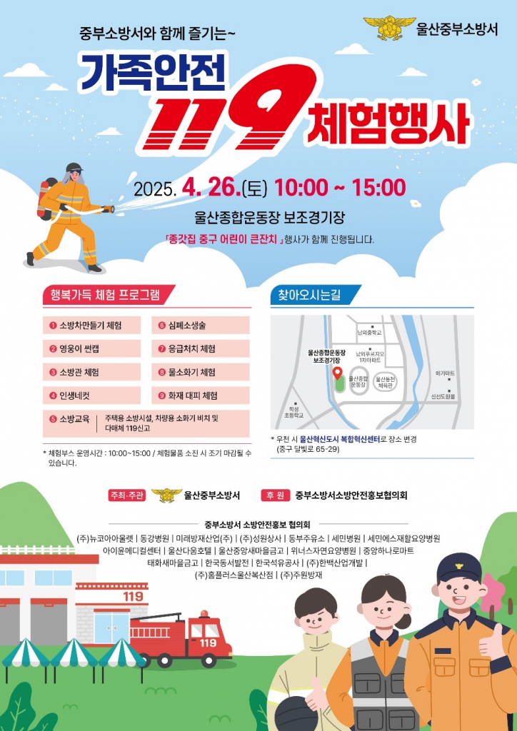 울산 중부소방서는 26일 오전 10시부터 오후 3시까지 중구 남외동 종합운동장 보조경기장에서 '가족안전 119체험행사'를 개최한다.