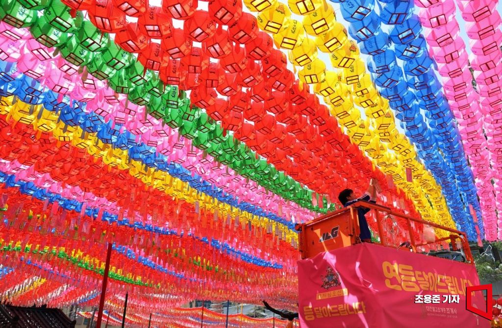 부처님오신날을 10일 앞둔 25일 서울 종로구 조계사 관계자가 시민들이 접수한 소원성취 연등을 매달고 있다. 2025.4.25 조용준 기자