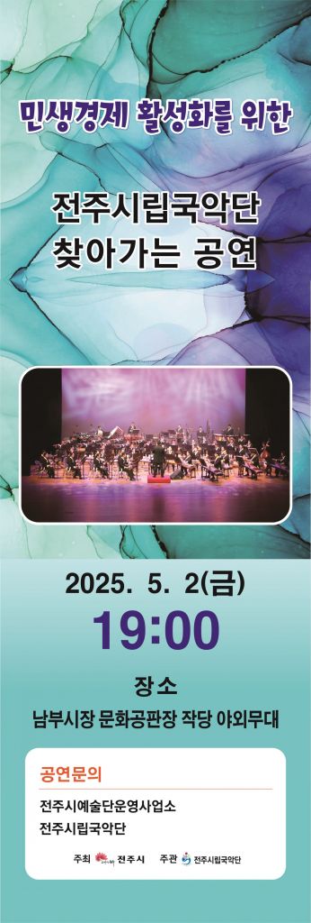 전북 전주시립국악단(예술감독 겸 지휘자 심상욱)은 내달 2일 오후 7시 남부시장 문화공판장 작당 야외무대에서 찾아가는 국악 공연을 선보인다고 25일 밝혔다.
