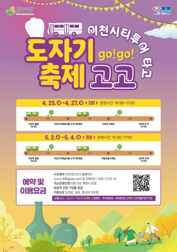 시는 축제와 지역 관광을 연계하기 위한 특별 시티투어 프로그램인 '이천시티투어 타고 도자기축제 고(GO)! 고(GO)!'도 다음 달 4일까지 운영한다.