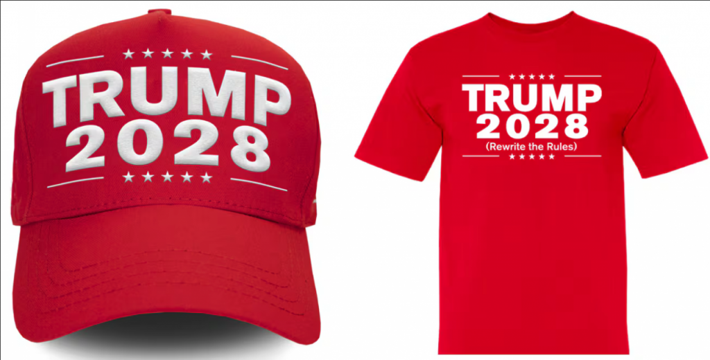 도널드 트럼프 미국 대통령이 3선 도전 가능성을 열어둔 발언을 이어가는 가운데, 트럼프 대통령 일가가 운영하는 공식 온라인 스토어에서 '트럼프 2028'이 적힌 모자와 티셔츠를 판매하기 시작해 논란이 일고 있다.
