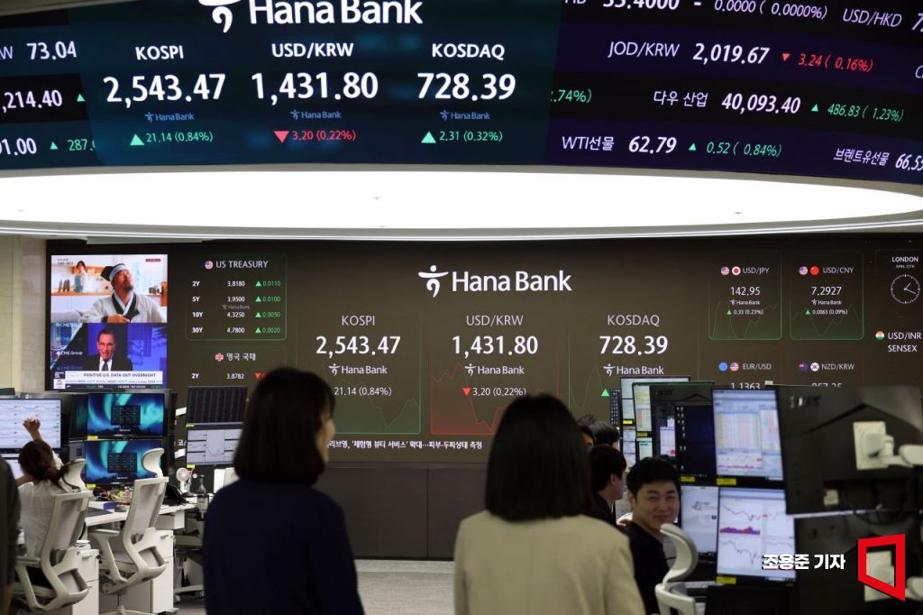25일 서울 중구 하나은행 본점 딜링룸에서 딜러들이 업무를 보고 있다. 이날 코스피는 전 거래일보다 22.26p(0.88%) 오른 2,544.59로, 원/달러 환율은 3.0원 내린 1,432.0원, 코스닥지수는 3.48p(0.48%) 오른 729.56으로 장을 시작했다. 2025.4.25 조용준 기자