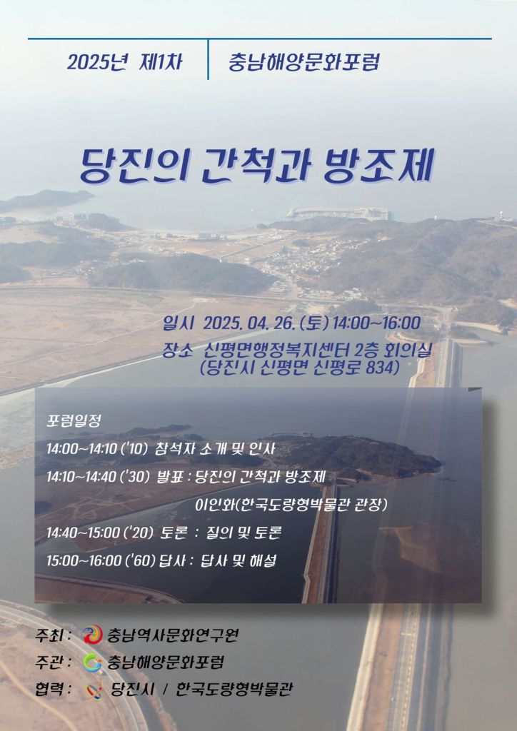 역사문화연구원은 '당진의 간척과 방조제'를 주제로 오는 26일 오후 2시부터 당진시 신평면 행정복지센터 2층 회의실에서 올해 첫 번째 '충남해양문화포럼'이 열린다고 밝혔다.
