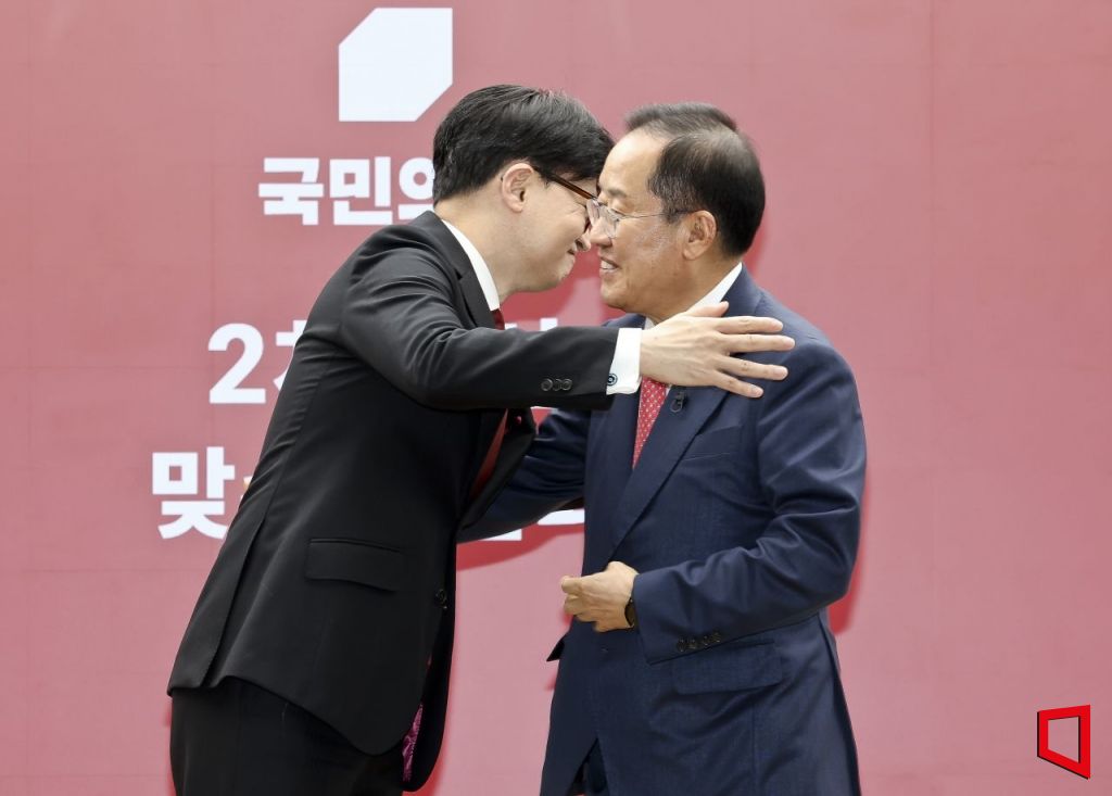 국민의힘 한동훈 대선 경선 후보와 홍준표 대선 경선 후보가 23일 서울 여의도 국민의힘 중앙당사에서 열린 2차 경선 토론회 미디어데이에서 포옹하고 있다. 2025.4.23 국회사진기자단