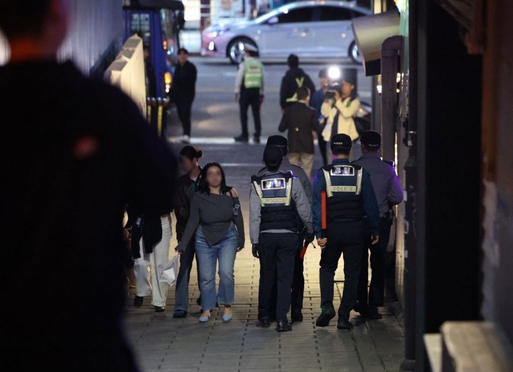 2024년 핼러윈데이(10월 31일)를 엿새 앞둔 25일 저녁 서울 용산구 이태원 골목에서 경찰관들이 다중운집 인파사고를 대비해 거리 순찰활동을 하고 있다. 연합뉴스