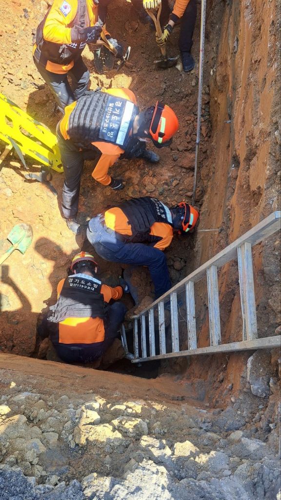 26일 낮 12시 21분쯤 경기 고양시 일산동구 풍동의 한 도로보수공사 현장에서 작업 중이던 근로자 2명이 토사 붕괴로 매몰되는 사고가 발생했다. 소방 대원들이 구조활동을 벌이고 있다. 경기도소방재난본부 제공