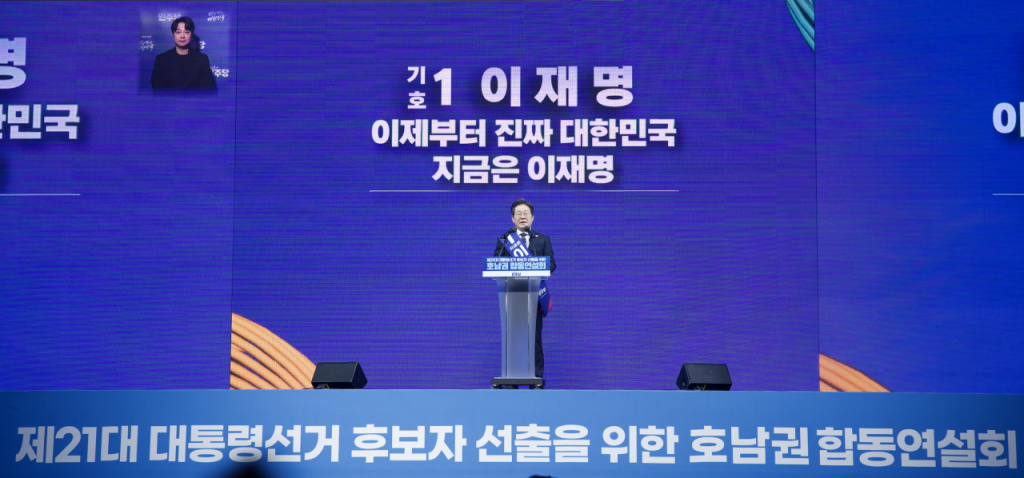 이재명 더불어민주당 대선 경선 후보가 26일 광주 김대중컨벤션센터에서 열린 호남권 합동연설회에서 정견 발표를 하고 있다. 송보현 기자