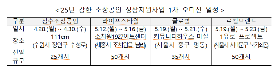 장수소상공인 유형의 1차 오디션은 이달 28일부터 30일까지 수원시 장안구의 111CM에서, 라이프스타일 유형은 오는 5월12일부터 16일까지 5일간 세종시 조치원의 1927 아트센터에서 진행된다. 글로벌 유형은 5월19일부터 21일까지 서울 중구 커뮤니티 하우스 마실에서, 로컬브랜드 유형은 5월19일부터 23일까지 서울 서대문구 북가좌동 1유로 북가좌 프로젝트에서 개최될 예정이다.
