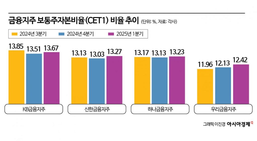 하나금융지주의 1분기 CET1 비율도 13.23%로 전분기 대비 0.10%포인트 상승했다. 1분기 순이익이 1조1277억원으로 전년 동기 대비 9.1% 증가한 1분기 기준 역대 최대를 기록하면서 CET1도 개선됐다. 하나금융 관계자는 "주주환원의 기반이 되는 보통주자본비율을 목표 수준인 13.0∼13.5% 구간에서 안정적으로 관리하고 있다"고 말했다.